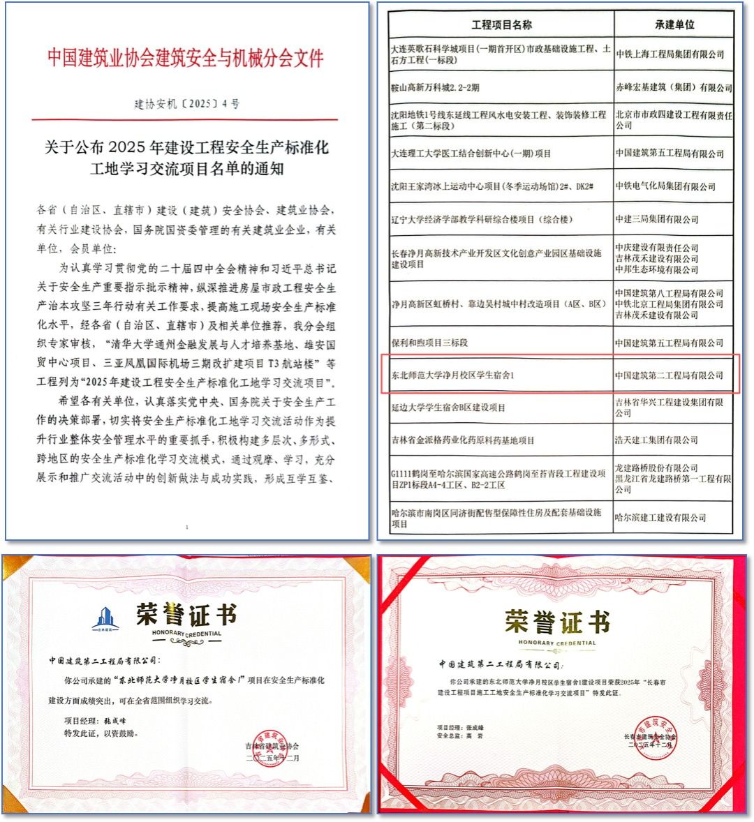 近期,我校“净月校区学生宿舍1建设项目”连续获评中国建筑业协会建筑安全与机械分会《2025年建设工程安全生产标准化工地学习交流项目》、吉林省建筑业协会《吉林省建设工程项目施工安全生产标准化工地》、长春市建筑安全协会《2025年长春市建设工程项目施工工地安全生产标准化学习交流项目》。